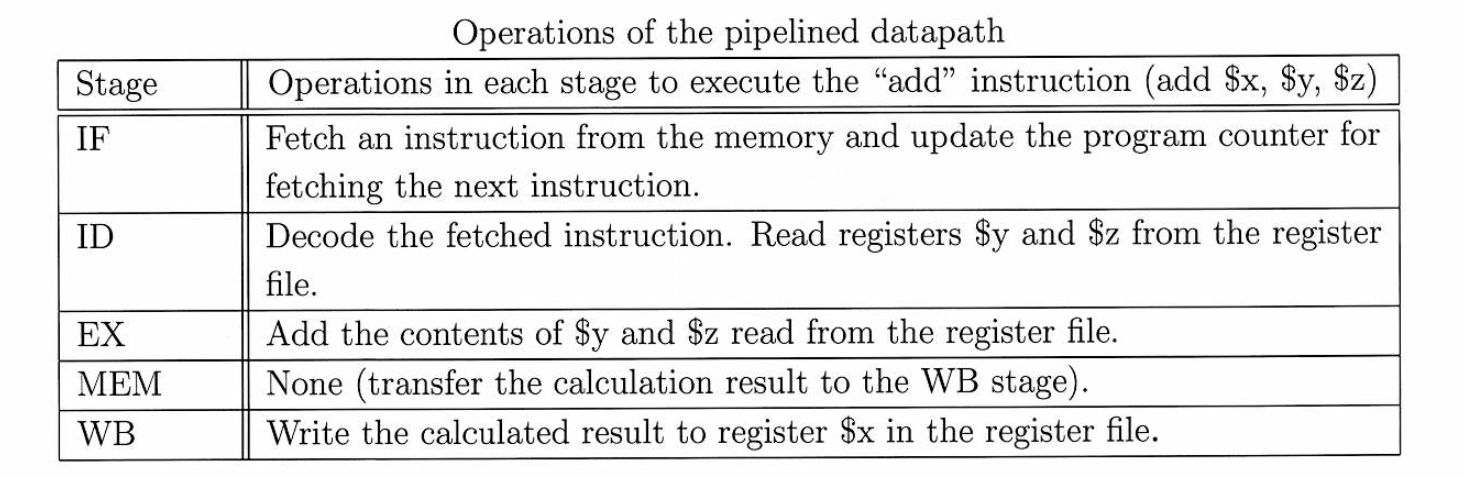[Q2] Let us consider an in-order microprocessor that has 5-stage pipelined datapath. The implemented pipeline stage are IF, ID, EX, MEM, and WB. The operations in each stage for the “add” are defined in the following table. Assume that the operations in each pipeline stage can be completed in one clock cycle. The written data in the WB stage of an instruction can be read in the ID stage of a subsequent instruction in the same clock cycle. All RAW(Read-After-Write) hazards are resolved by applying a pipeline stall mechanism. Answer the following questions.